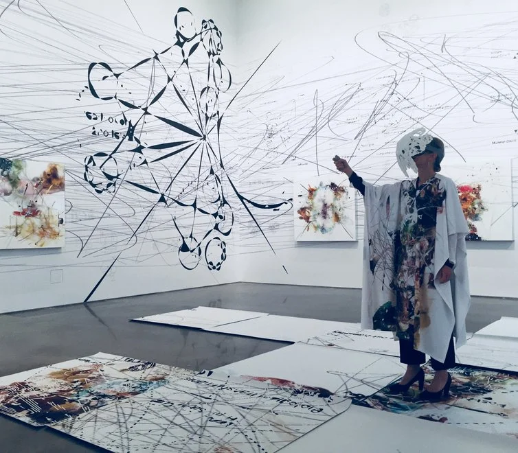 In 2018, Matthew Ritchie was the second Leslie and Brad Butcher Artist-in-Residence at Moody following Olaf Eliasson’s own exhibition and project in 2017. Working at an institution with a sizable budget certainly helps the collaboration, but understanding which ideas will work and which ones will fall short is key. I knew of Ritchie’s earlier works, consisting largely of paintings, installations, and sculptures. His pieces originate from the nooks and crannies of science, sociology, and anthropology. With the exhibition at Moody and through the residency was a brand new body of work exceptionally built on top of a new technology and research heavy foundation. You can read about the works and the ideology of the process from an interview I did with him here if so inclined. With so much knowledge injected into the exhibition, it would seem impossible on how to present everything all at once, to keep the body of work clean and engaging yet still accessible. In one of the large secondary galleries, visitors were presented with a half-dozen cult-like, masked figures wandering around the installation, which was covered in Ritchie’s mark making, imagery, and special hand sketched coding upon the floors and walls. First walking through the door, visitors were instructed to change into a robe and place a tribal-style helmet, concealing the VR equipment, upon our heads. Once placed upon your head, you were now part of the installation yourself. You became one of the wandering cult figures, working your way through the space, reaching through the air to tap and open floating symbols inside the ether of which you were one with. Each symbol, once opened, presented you with videos, lectures, and a vast amount of readable material.