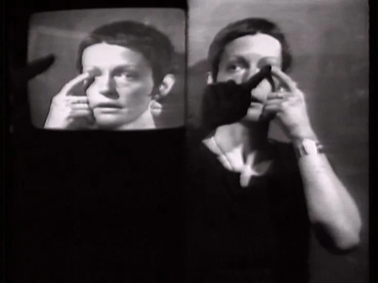In Jonas’s Left Side Right Side, the artist hovers in between a spatial ether. Splitting her image of what is now and what is reflected or assumed. Dancing in the ambiguity of who one is and what we or others translate us to be. Through drawing on herself she recreates or reinvents identity. The black and white grainy video is captivating and hypnotic as it floats behind the vale of a perceived dream state. Mirroring the concept, Anne Bean and Dov Eylath’s color video Blue for You, 1981 depicts Bean covering her face with an unseen medium. With each mark, her skin and self vanish, slowly revealing Eylath behind. The two whisper confessions of who we are as individuals and with another person, more and more of one disappears with the other becoming dominant. Eylath seems reluctant to become part of Bean as she is still removing herself and revealing more of him. As we draw our ideas upon each other with friends or lovers, do we leave enough behind to be recognized? By the end there is only an Anne Bean voided shape that remains, a hollow space of who she once was. The work is heavy with poetic sadness, yet the pair resolve with content and tranquility.