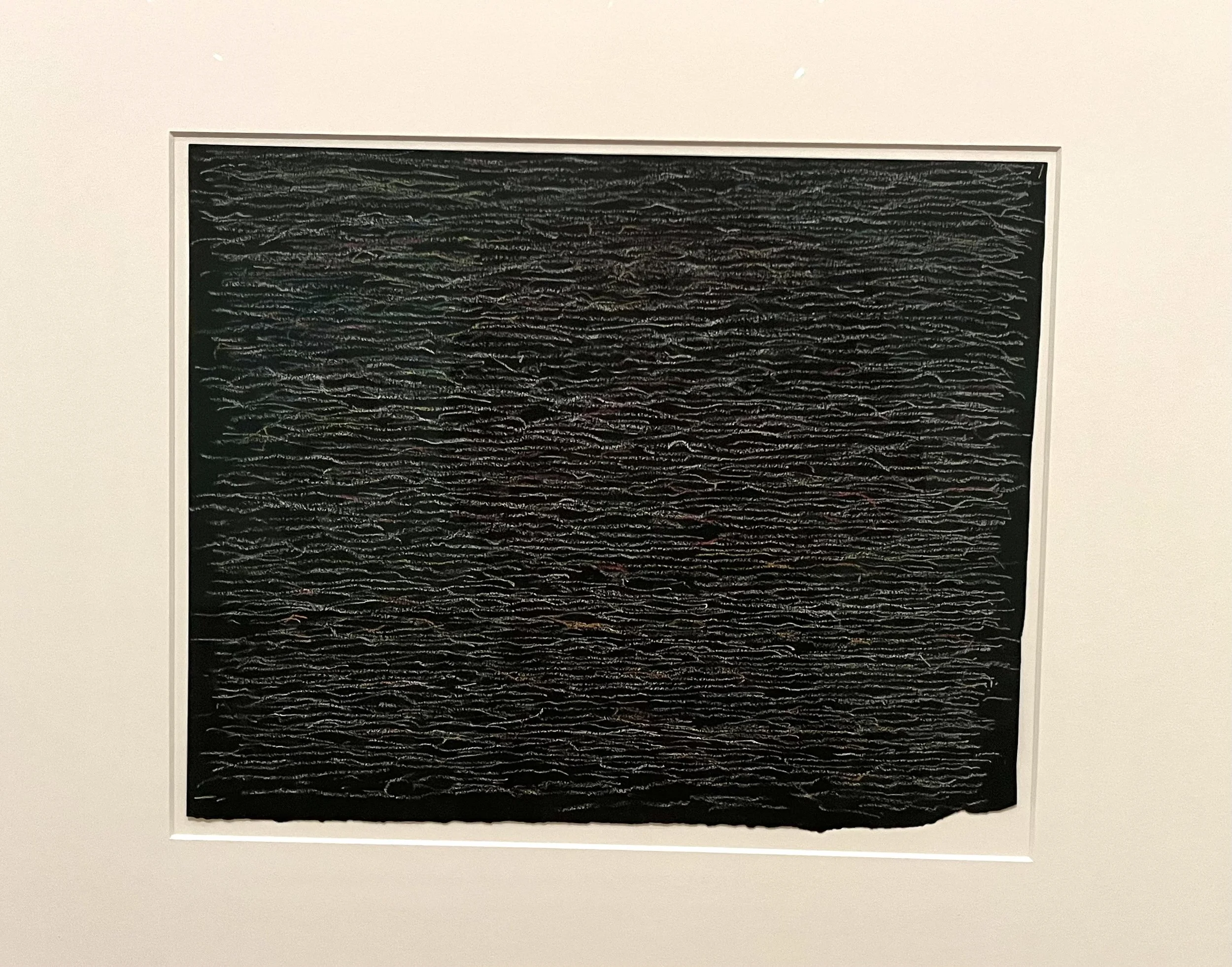 Nam June Paik is the forefather of video, monitor, and digital assembly, and it's not uncommon to see dozens of screens at once in his work. Here, the minimal display is an ember set to ignite the entire exhibition. A single note or love letter portrayed from this one single glowing relic. The artist uses the less-is-more principle, or so it would appear until you move in closer to witness the chaos. Other static intrigues are presented in his micro mark making, mimicking the information in micro bursts on the paper. Repeated over and over again, small images combine as a whole to form what appears to be a rectangle or screen. Another all black, static, rain, or is it snow. As children, I'm sure we all at one time turned the stations until we came across the “snow” of information and broken pictures, sitting front and center with our eyes fixed. Can you hear or see it? The white noise takes over, and our minds meld with the tube creating an imaginary realm of images.