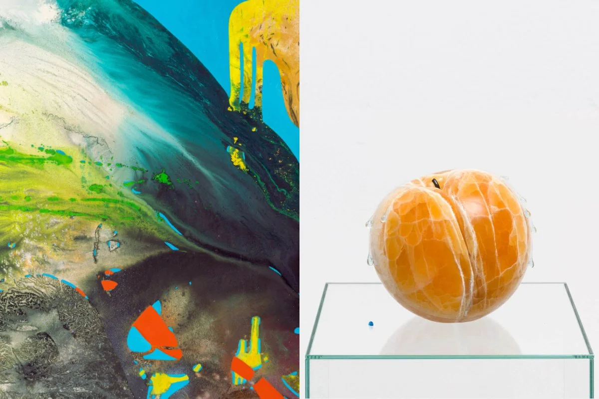 Left: Vian Sora, detail of ‘Floodgates,’ 2021. Mixed media finished w/oil on canvas. Courtesy of Kentucky Performing Arts Foundation. Right: Nevine Mahmoud, ‘Fruit’ (Wet Chord), 2020. Calcite, glass, steel, and paint. Collection of Sarah Stoker.