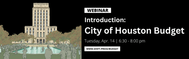 A city’s budget is vast and layered, covering information in a whole bunch of data. Luckily, Alice Liu of West Street Recovery and Jaison Oliver of HouArts in Action are hosting this webinar to help you understand your role as a Houstonian and how you can make your interests heard, whether you want to support the arts and libraries or have something to say about flooding or the cops. Jack into their matrix and learn, learn, learn.