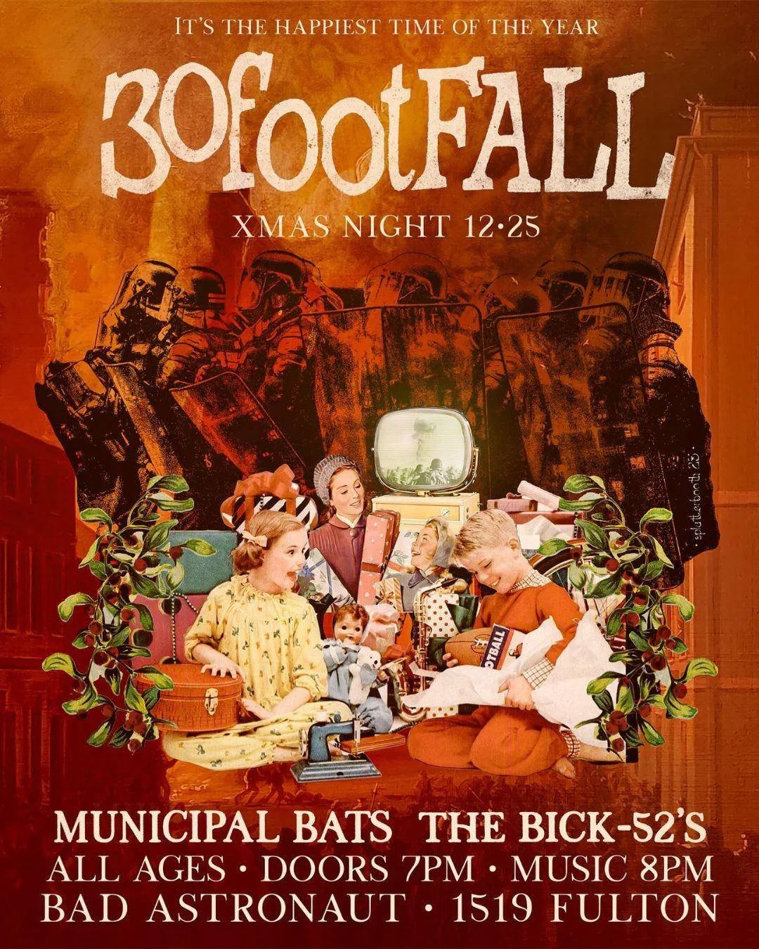 It’s a noisy Christmas tradition that 30footFALL has put on since at least when I was in high school, and it’s a hoot. While it was long housed in Fitzgerald’s, it’s a little more nomadic these days. This year they’re setting up shop at Bad Astronaut, which is very spacious and cool. Municipal Bats & Bick - 52s open, so you’ve got a very punk Christmas night to enjoy.