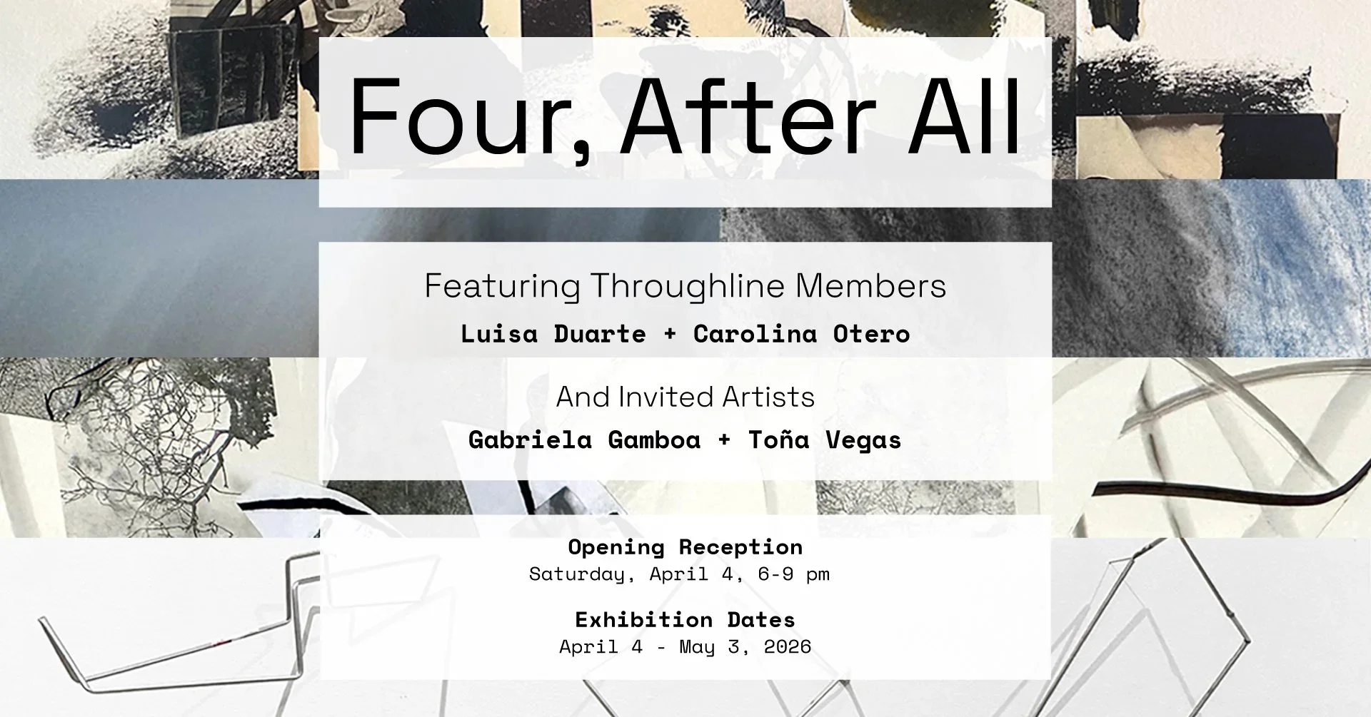 Swing by Throughline on what seems to be a very active Saturday you’ve got planned to see the work of member artists Luisa Duarte and Carolina Otero, and their invited guests Gabriela Gamboa and Toña Vegas in Four, After All.