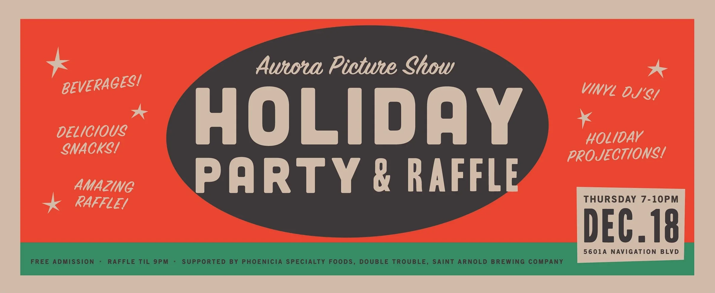 Put on your finest holiday threads and get yourself to the East Side to celebrate the Aurora Picture show. Aurora is having a holiday party! Come for the libations by Double Trouble and Saint Arnold, light bites provided by Phoenicia, music provided by DJs Gracie Chavez, Marcelluz Gualez, Alex la Rotta, and Peter Lucas, and a fantastic raffle featuring an array of great items, experiences, and gift cards. More info below